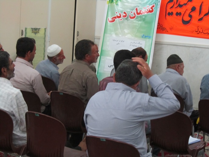گفتمان ديني با موضوع ديدگاه اسلام در مورد حمايت از توليد وسرمايه ملي با سخنراني حجت الاسلام ترابي برگزارشد.وي ضمن اشاره به روايت پيامبر اكرم(ص) که فرمود، هرکس بار زندگي اش را بر دوش ديگران بيندازد، و سربار مردم باشد، از رحمت خدا به دور است، در مورد آثار مثبت کار و تلاش و همچنين عواقب منفي بيکاري مطالبي بيان كرد.