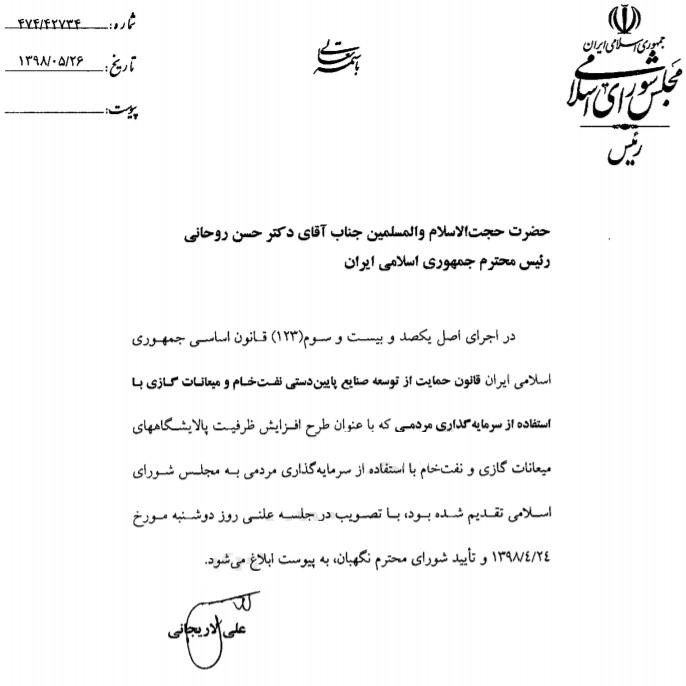 ابلاغ قانون قانون حمایت از توسعه صنایع پایین دستی نفت خام و میعانات گازی با استفاده از سرمایه گذاری مردمی "توسط رییس جمهور