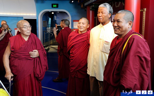 عکس یادگاری راهبان تبتی با مجسمه مومی نلسون ماندلا در موزه مادام توسو در سیدنی