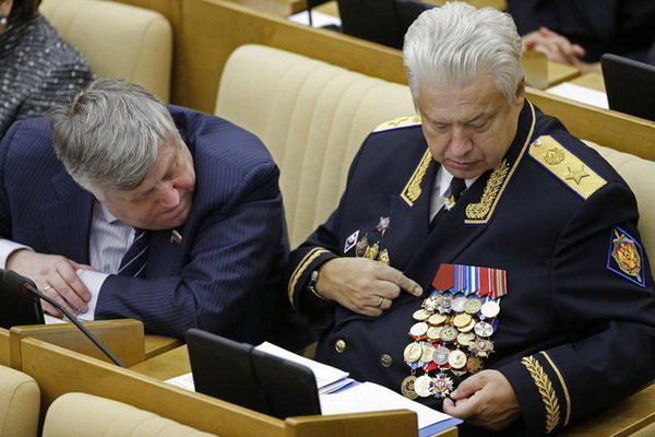 "میکولای کوالی یف" یکی از نمایندگان مجلس روسیه (دوما) در حال نگاه کردن به مدالها و نشانهایش