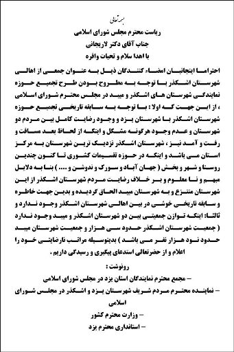 در بخشی دیگر از طومار امضاکنندگان با اشاره به سابقه جدایی چند روستا و بخش از شهرستان اشکذر و الحاق آنها به شهرستان میبد برخلاف رضایت مردم این شهرستان، عدم وجود توازن جمعیتی را مشکل اساسی تجمیع حوزه انتخابیه مجلس برای شهرستانهای اشکذر و میبد دانستند.