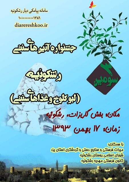 وي با اشاره به برنامه ريزي هاي صورت گرفته براي برگزاري سومين جشنواره آيين هاي سنتي رشكوئيه اضافه كرد: به مناسبت فرا رسيدن دهه مبارك فجر و با همكاري اداره كل ميراث فرهنگي، صنايع دستي و گردشگري استان يزد، شوراي اسلامي روستا و كانون مهديه رشكوييه اين جشنواره با هدف معرفي مسابقه "لپو كلوخ" و همچنين ساير غذاهاي سنتي اين منطقه در روز 17 بهمن ماه سال جاري برگزار خواهد شد.