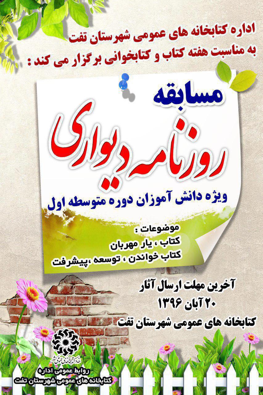 اولین دوره مسابقه روزنامه دیواری ویژه دانش‌آموزان مقطع متوسطه دوره اول تفت، به همت اداره کتابخانه‌های عمومی این شهرستان و همزمان با هفته گرامیداشت «کتاب، کتابخوانی و کتابدار» برگزار می‌شود.