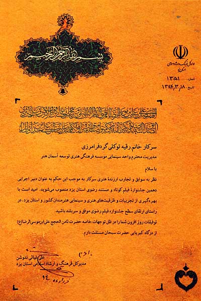 نظر به سوابق و تجارب ارزندۀ هنری سرکار به موجب این حکم به عنوان دبیر اجرایی دهمین جشنوارۀ فیلم کوتاه و مستند رضوی استان یزد منصوب میشوید. امید است با بهرهگیری از تجربیات و ظرفیتهای هنری و سینمایی هنرمندان کشور و استان یزد، در راستای ارتقای سطح جشنواره فیلم رضوی موفق و سربلند باشید.