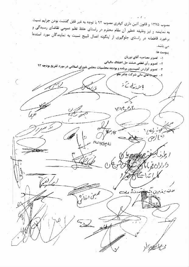 احتراما اینجانبان امضاء کنندگان ذیل پیرامون مطالب توهین آمیز آقای محمود نوریان مدیرعامل شرکت معدنی چادرملو خطاب به نماینده محترم مردم یزد و اشکذر در مجلس شورای اسلامی به استحضار میرسانیم :