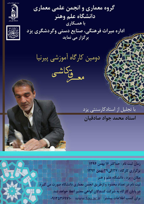 گروه معماری و انجمن علمی معماری دانشگاه با همکاری اداره میراث فرهنگی، صنایع دستی و گردشگری یزد، در نظر دارد در راستای احیاء هنرهای سنتی و از یاد رفته میراث كهن این سرزمین و از سویی معرفی و تجلیل از هنرمندان سنتی یزد؛ سلسله كارگاههای آموزش هنرهای سنتی (هنر معرق كاشی، هنر سفال برجسته، هنر مقرنس و...) با عنــوان " كارگاههای آموزشی پیرنیا" برگزار نماید.