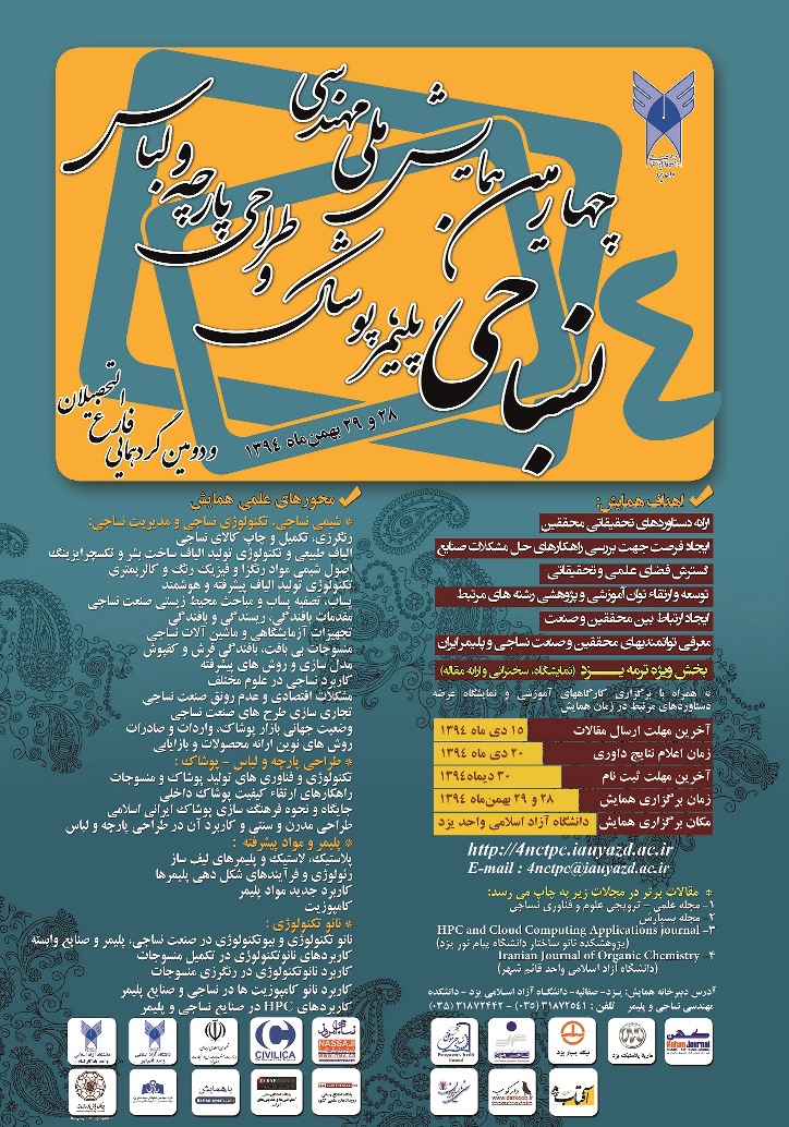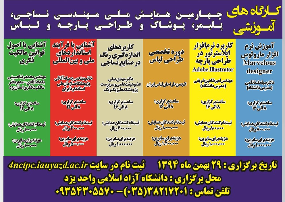 یزدفردا"چهارمین همایش ملی مهندسی نساجی، پلیمر، پوشاک و طراحی پارچه و لباس با همکاری فرهیختگان دانشگاه‌های معتبر، مراکز پژوهشی و صنایع کشور به میزبانی دانشگاه آزاد اسلامی یزد برگزار می‌شود.