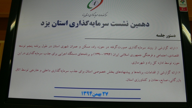 دهمین نشست سرمایهگذاری استان یزد روز سه شنبه با حضور مدیران دستگاههای عضو مرکز خدمات سرمایه گذاری استان و به ریاست استاندار یزد برگزار شد.