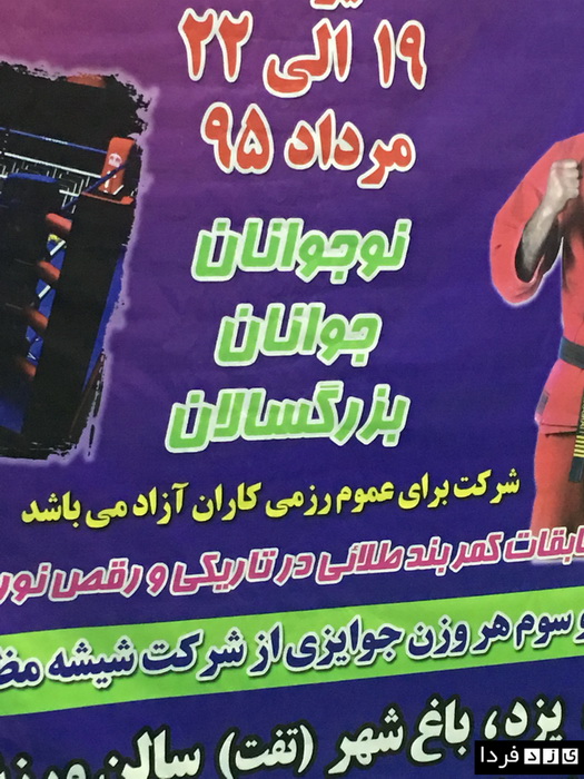 نکته جالب توجه دیگر نوشته ی زرد رنگ روی بنر این مسابقه است که گواهی می دهد شرکت برای عموم. در این مسابقه ازاد است . باور کنید این یک مسابقه قهرمانی کشور است که هر کسی که یک بیمه ورزشی برای رشته های رزمی در دست داشته باشد می تواند در ان شرکت کند البته شرط اصلی شرکت در این مسابقات پرداخت مبلغی در حدود صد هزار تومان برای هر نفر است ، صد هزار تومانی که بابت ان هیچ امکانات رفاهی به بازیکنان تعلق نگرفته است ورزشکاران یزدی حتی به ازای هفتاد هزار تومانی که پرداخت کرده اند ناهار هم به ان ها تعلق نگرفته است زیرا برای دریافت یک قورمه سبزی ساده به عنوان ناهار باید سی هزار تومان اضافه پرداخت کنند ، اینجا کسی نیست بپرسد که یک قورمه سبزی که در رستوران های لوکس این شهر قیمتی در حدود ده هزار تومان دارد چرا باید زمانی که در یک ظرف یک بار مصرف و با کیفیتی نا مشخص در شلوغی سالنی ورزشی با قاشق های پلاستیکی سرو می شود باید قیمتی در حدود سی هزار تومان را داشته باشد .