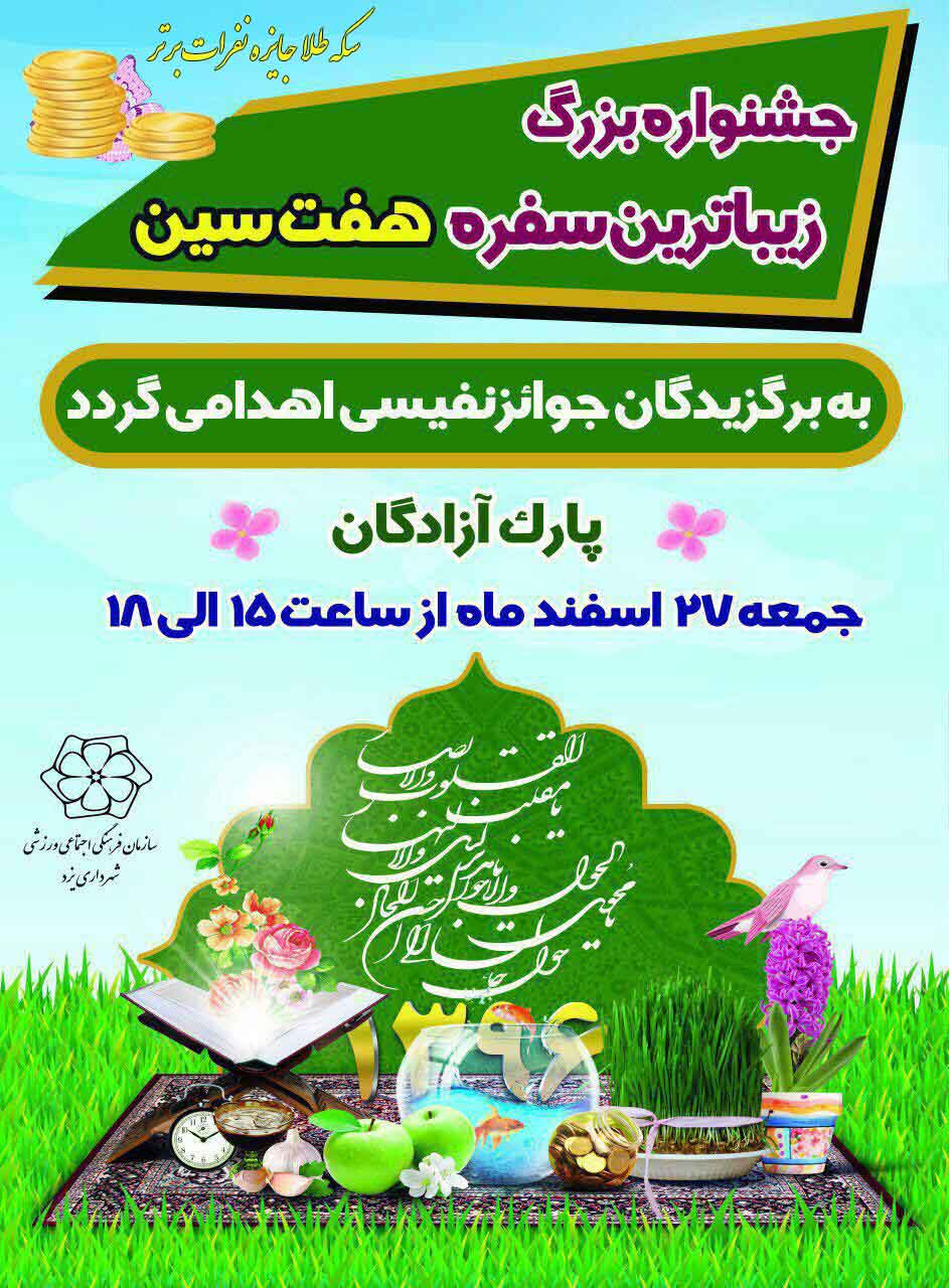 به گزارش روابط عمومی سازمان فرهنگی اجتماعی ورزشی شهرداری یزد، سازمان فرهنگی اجتماعی ورزشی شهرداری یزد، به منظور ارزش نهادن به آداب و رسوم ملي وکهن ايرانيان همزمان با فرارسيدن سال نو ، جشنواره بزرگ « زیباترین سفره هفت سین» را به همراه جوایز ارزنده، روز جمعه(27اسفندماه95) در پارک آزادگان برگزار خواهد کرد.