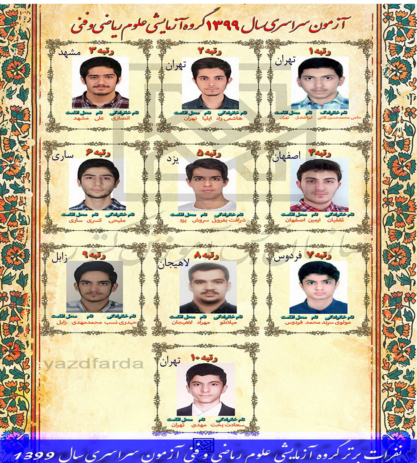 نفرات برتر گروه آزمايشي علوم رياضي و فني آزمون سراسری سال 1399