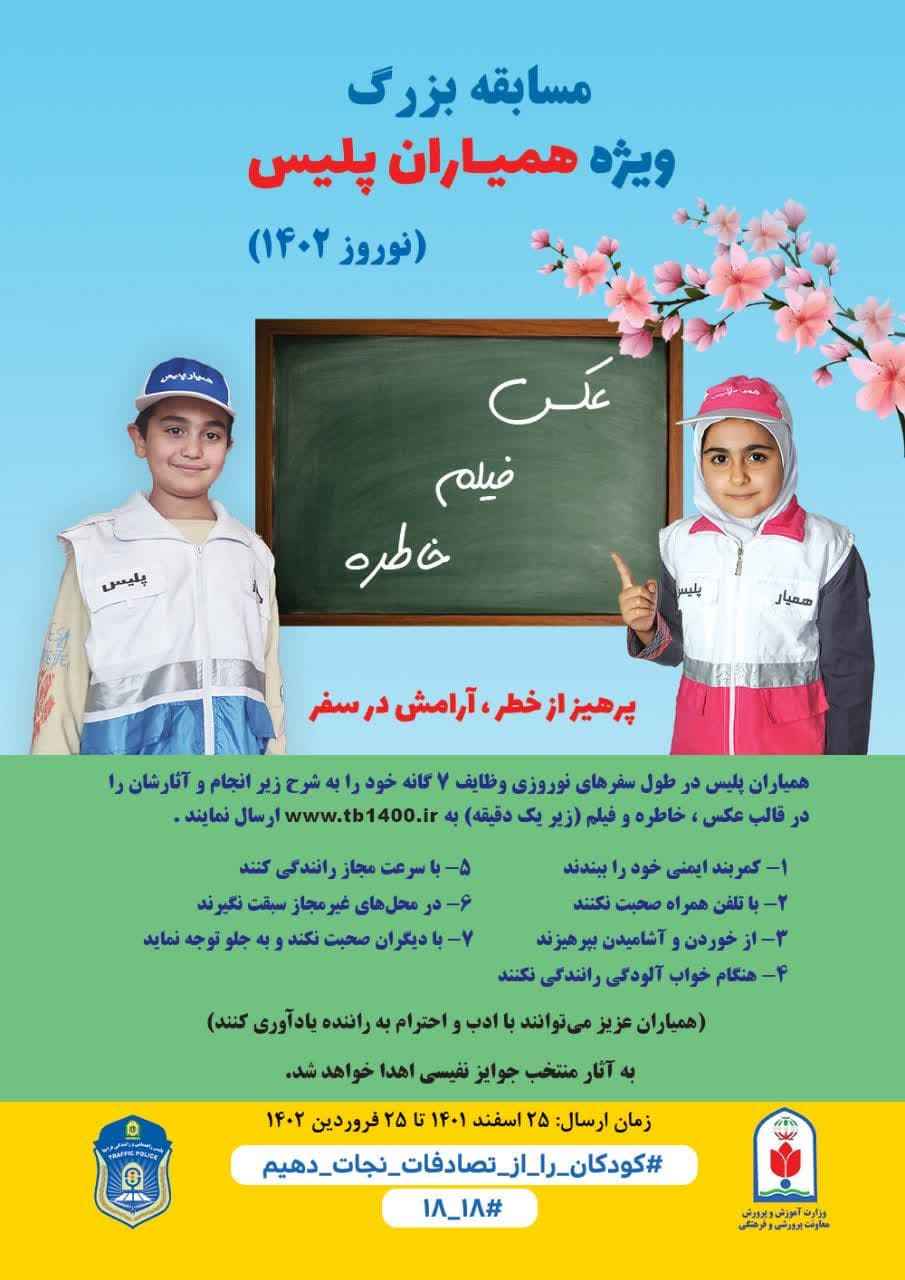 مسابقه ویژه همیاران پلیس در نوروز 1402 برگزار می شود و علاقه مندان می توانند در سه محور عکس، فیلم و خاطره آثار خود را به دبیرخانه مسابقه ارسال نمایند.