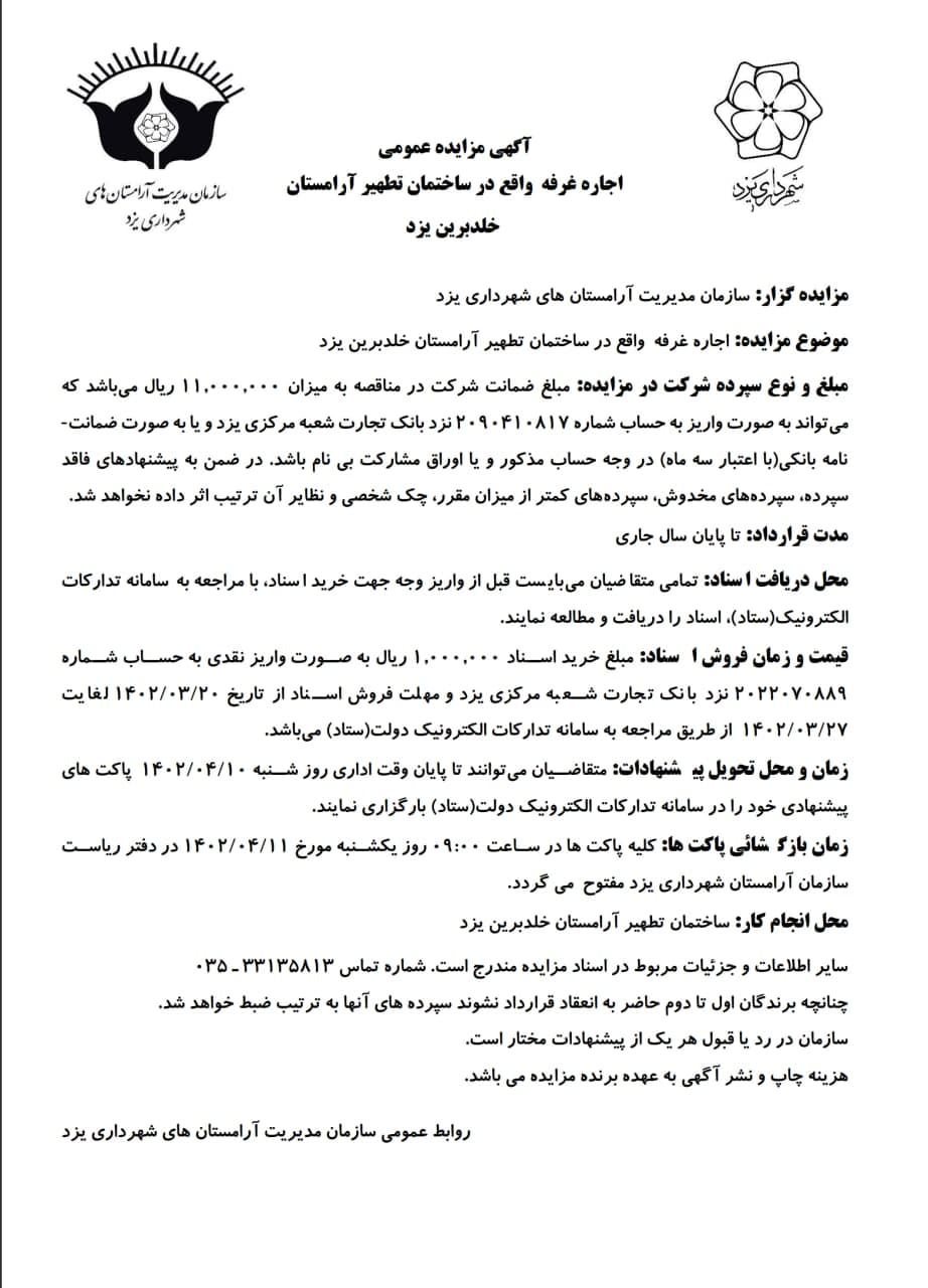 مناقصه اجاره غرفه واقع در ساختمان تطهیر خلدبرین - سازمان آرامستان ها