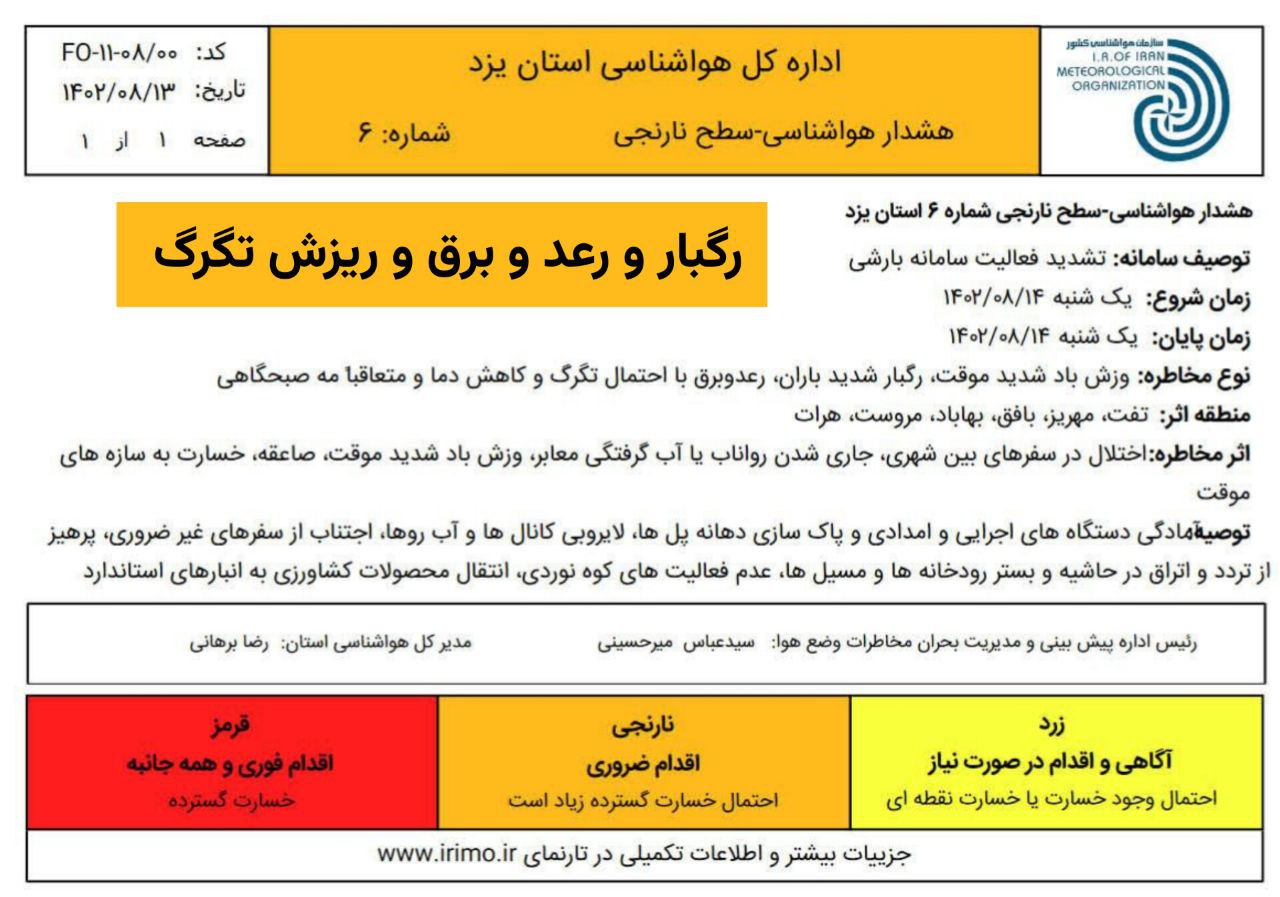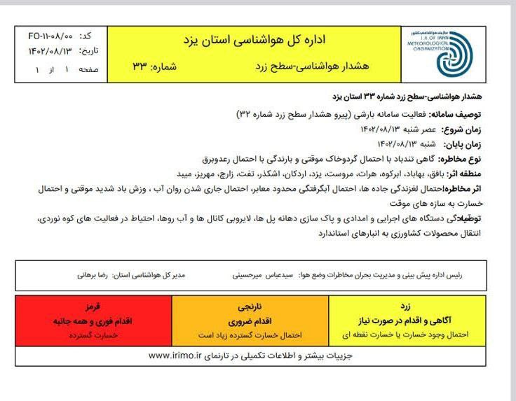 اطلاعیه سطح زرد اداره هواشناسی استان