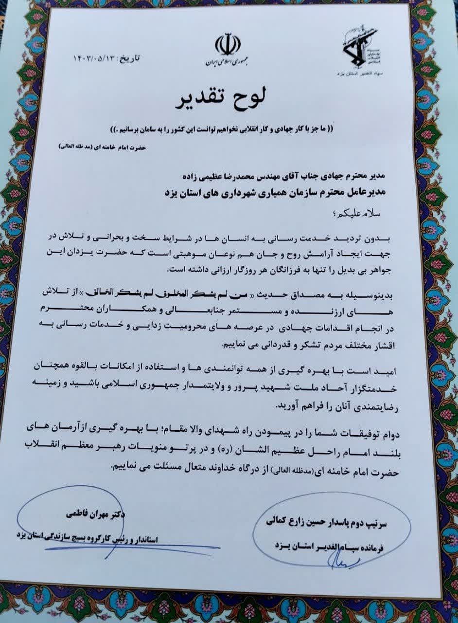 یزدفردا؛ در همایش بزرگ جهادگران استان یزد که با حضور جهادگران فاطمی در سالن شهید منتظر قائم استانداری برگزار شد، مهران فاطمی استاندار یزد و رئیس کارگروه بسیج سازندگی استان، سردار حسین زارع کمالی فرمانده سپاه الغدیر استان، معاونان استاندار و دادستان کل استان از محمدرضا عظیمیزاده مدیرعامل سازمان همیاری شهرداریها بهعنوان مدیر جهادی استان و به پاس اقدامات جهادی در عرصههای محرومیت زدائی و خدمات رسانی به اقشار مختلف مردم؛ با اهدای لوح تقدیر، تجلیل کردند.