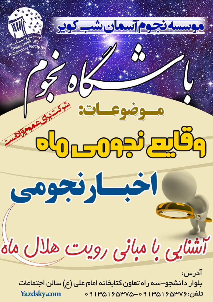 موسسه نجوم آسمان شب کویر در نظر دارد درعصر روز پنجشنبه 5 تیر ماه باشگاه نجوم با موضوعات آشنایی با مبانی رویت هلال ماه ،تازه ترین اخبار نجومی و وقایع نجومی در سالن همایش کتابخانه امام علی برگزار کند.
