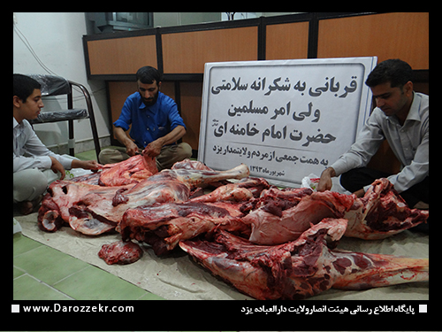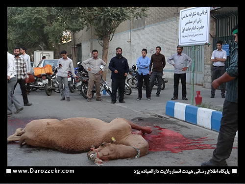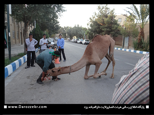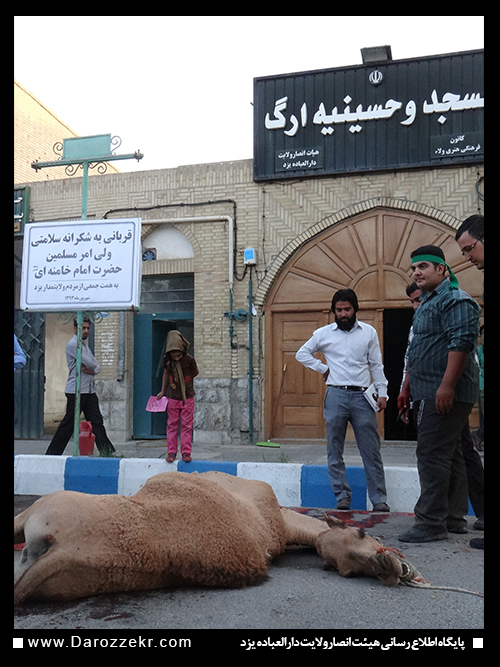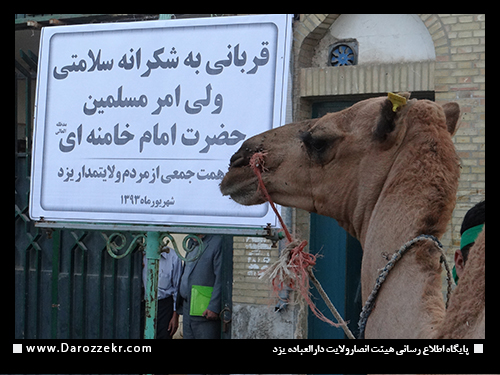 هیئت انصار ولایت دارالعباده یزد به شکرانه سلامتی و ترخیص مقام عظمای ولایت، حضرت امام خامنهای، از بیمارستان، شتری را قربانی کرد.