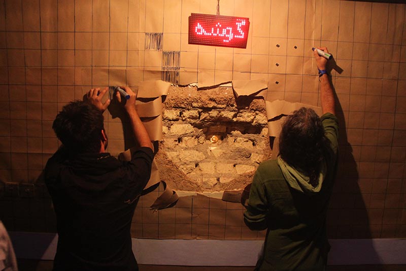 تماشاگران با ورود به محل اجرا پیام ها، ایده ها و ذهنیت های خود را در رابطه با مفهوم حقیقی "نماند قرار" به اجرا گر منتقل می کردند و او جملات را بر کاغذهای روی دیوار می نگاشت.