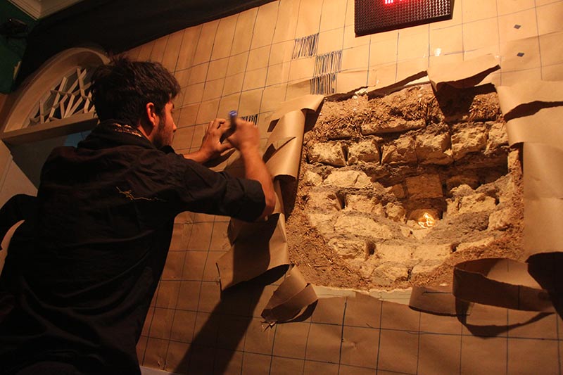 در این اتفاق، به یاد آوارها و ویرانی های جنگ غزه نمونه ای از حقیقت خرابی بر گوشه ای از دیوار نقش بسته و سوزنی از جنس "طلا" به نشانه کودکی از دست رفته در آن جا گرفته بود.