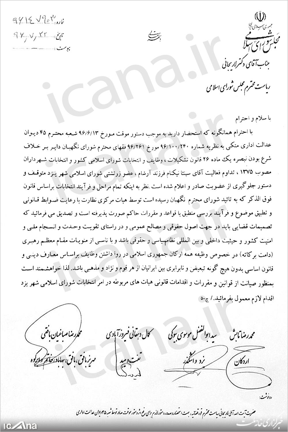 تابش خبرداد: نامه مجمع نمایندگان یزد به دکتر لاریجانی/حکم سلب عضویت نماینده زرتشتی شورای شهر یزد متوقف شود+تصویر نامه